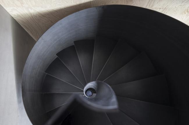 起居室中一个旋转楼梯连接上层,内置雕塑画廊,四个房间,两个卫生间以及一个开放办公区域。一个观景屋顶平台被楼梯所连接到建筑外部。