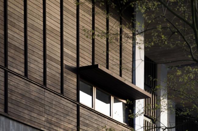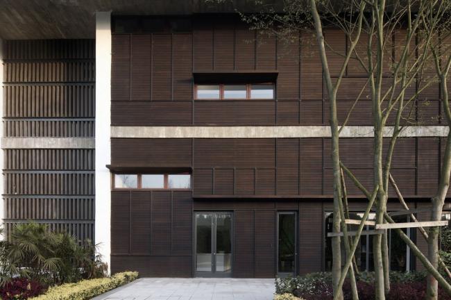文化中心综合体被视作连接工业园区与自然景观的纽带,其建筑空间由一系列带内院的馆所以线性排列的方式组成,而形式语言则由深檐和木板墙等低调的本土化词汇所构建。