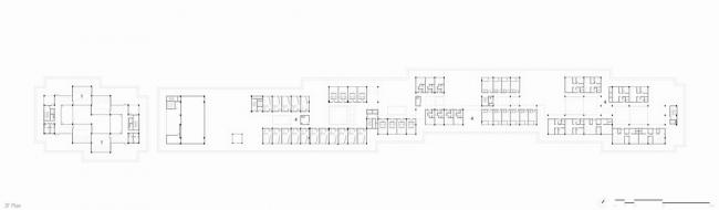 馆所的断面中,无梁混凝土楼板从中部朝两侧悬挑而出,好拟一把张开的伞。这把“伞”从檐口到中心处逐渐由薄变厚,并在最厚的区域承担藏匿暖通管道的需要。