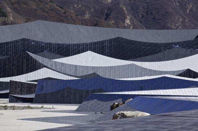 “经折”和剧场均采用了不同材质的表皮,包括石材、玻璃和不锈钢等材料。通过这些材料的反光和透射的特点,体量被化解为不同尺度的起伏的图案,不同程度地影照着周围的景象,蓝天、白云、山峦、树木,也包括身处其间的观众,一切尽在似有与似无之间,极大地消解着建筑物的轮廓线,破解建筑体量对周围环境的压力。 “经折”被“掀起”的部分,形成游人穿越的通道,呈现出的是中国传统木构建筑的细部构建,隐喻着建筑所处的人文环境。