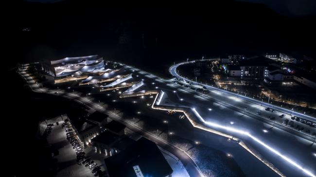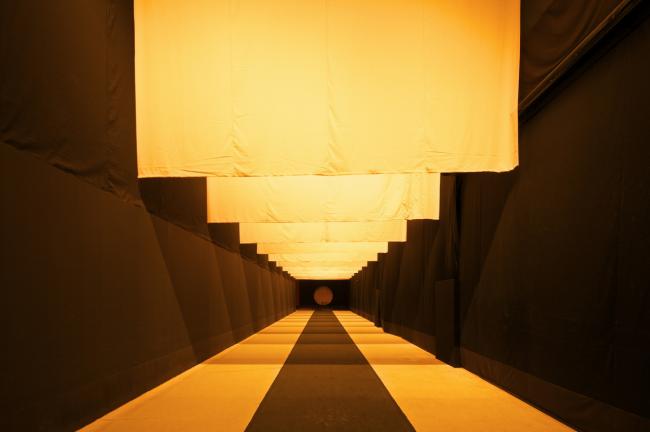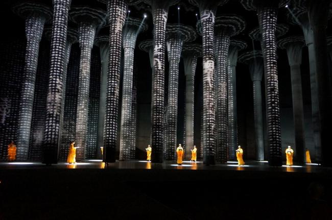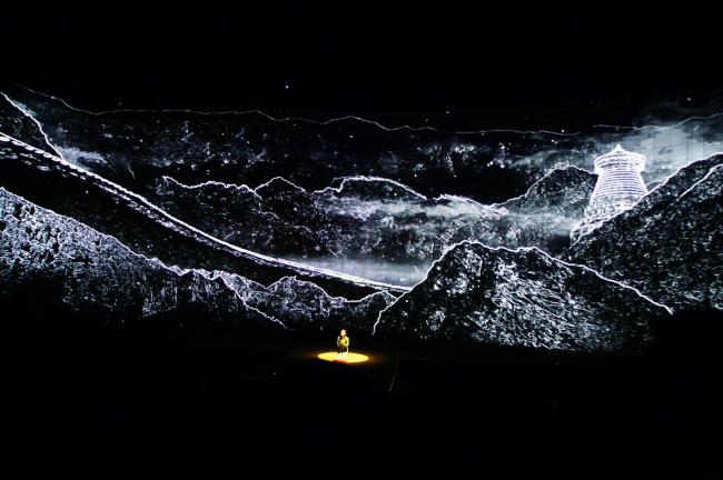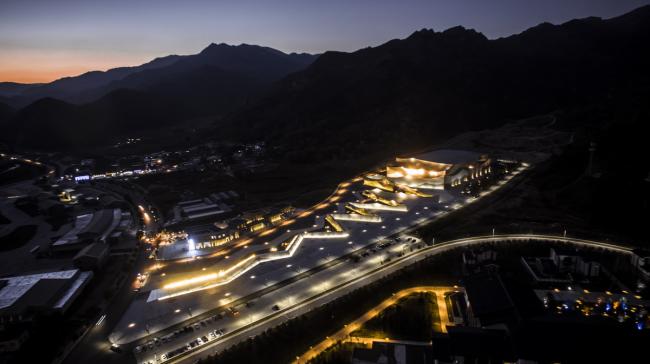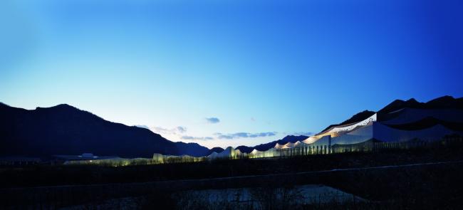 “又见五台山”剧场位于五台山景区南入口外、两座小山前的开阔场地上。由于大型情景演出的需要,剧场空间是一个长131米、宽75米、高21.5米的大空间。730米长、徐徐展开的“经折”置于剧场之前,上面刻着“经中之王”的《华严经》经文。七个“经折”空间由高至低排列形成渐开的序列,成为剧场表演的前奏。观众从进入“经折”空间之后,演出就开始了——剧场就像一本博大的经书慢慢在观众眼前打开。所以说《又见五台山》专属剧场是一个从室外延伸至室内的剧场。