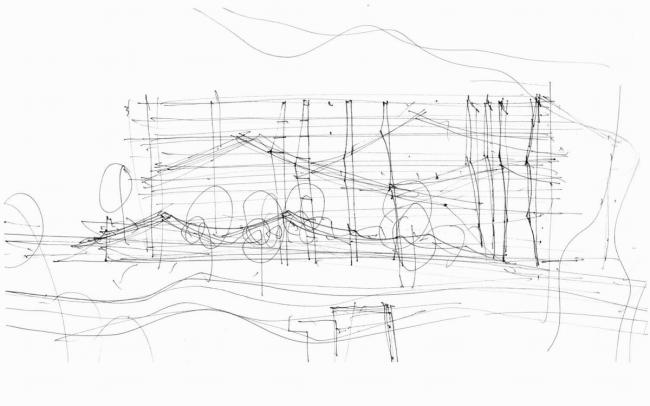 ▲ 概念草图-立面使用现代材料,形成层层叠叠的抽象图式,与环境融合