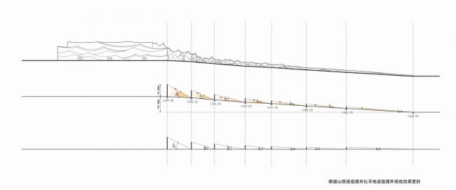 ▲ 折墙高度在中段徒然增高,在道路边观看时形成节奏由缓渐急的视觉曲线