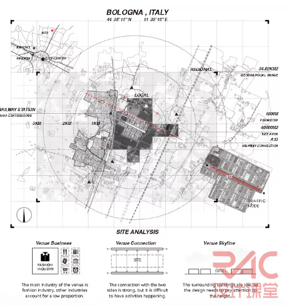 设计位于意大利博洛尼亚的一个工业区中,这个设计的场地是长条形的,周围的建筑过去大都是低矮的工业厂房,整体感觉很简洁但却实用的工业感,以服装生产和批发为主。
