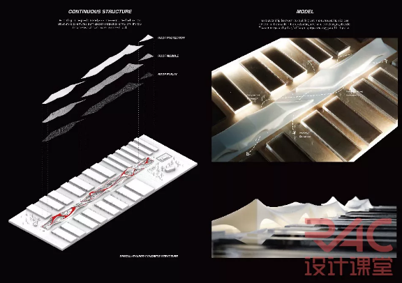设计任务是建设一个时尚展览中心,我在其中设计了一个连续异形结构作为展览空间来承载未来的各种各样的活动,根据周围的场地分析来推敲建筑的形态,最终选择用了巨型混凝土来完成大跨空间,参考了Nervi的St Mary Cathedral,用其简洁有力的气质与工业感与场地相结合。在高度上的连绵起伏也给整一个工业区带来新的艺术气息,也希望各种丰富的业态来激活这个工业区与周围社区的互动。