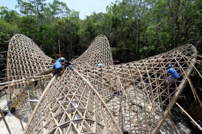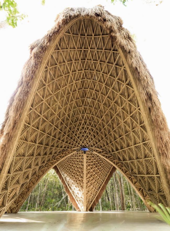 由于其在快速生长收获周期中良好的碳封存作用及其在重量比上的高强度(特别是在编织在一起时),竹子是一种具有惊人潜力的可持续环保建材。 建筑结构通过设计和计算足以抵抗飓风。 该项目所用的竹子在邻近的恰帕斯地区可持续种植。在外部,则覆盖了一层当地的Zacate(草茅屋顶),这是该地区典型的保护结构,其能在让建筑避免受雨水影响的同时,能在潮湿的热带气候中具有良好的通风。