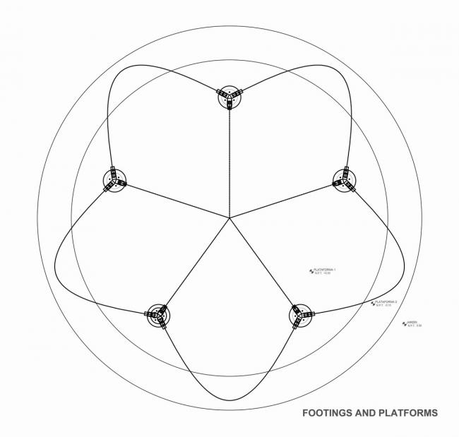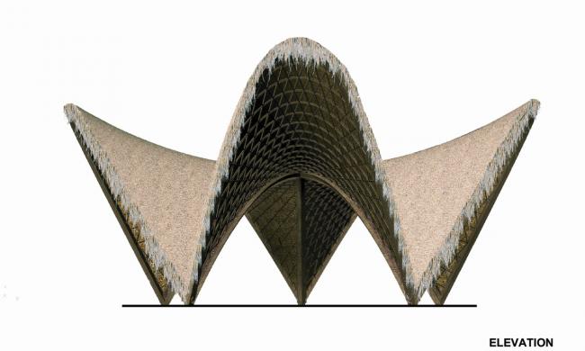 受到菲利克斯·坎德拉的悬链线钢筋混凝土外壳作品的启发,该项目是一个由竹材建成的五面悬链结构。拱形拱顶相互支撑,共存的概念渗透在各个构件互相依赖的结构中,以此提醒我们社区的相互依赖关系以及我们同舟共济所能取得的成就。由在现场弯曲后的扁平的竹节,通过以螺纹或以捆绑的方式连接在一起,一个个单独的编织状竹元素一起组成了一个整体。