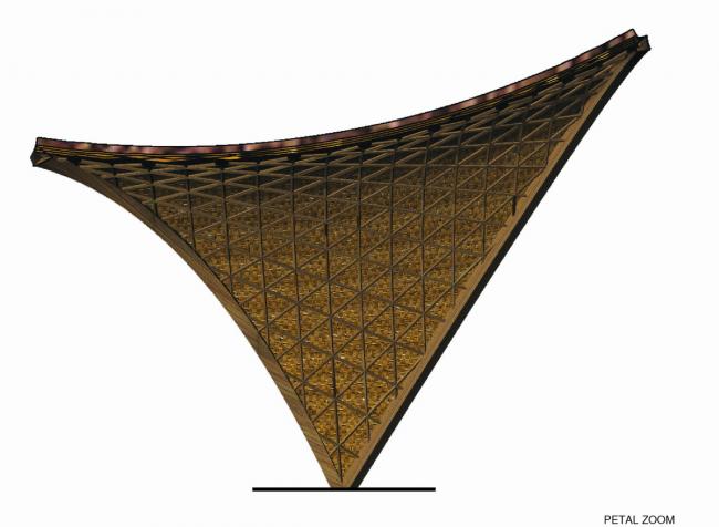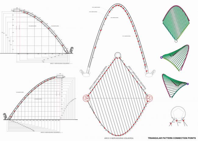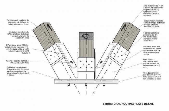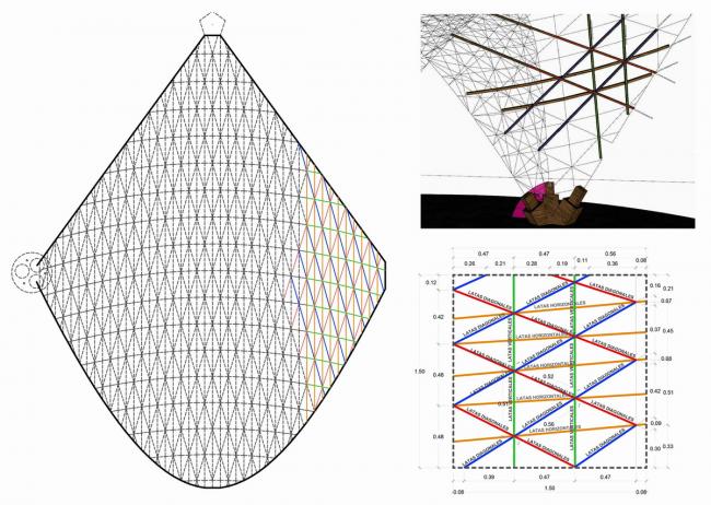 竹质拱形梁由现场弯曲的扁平竹节组装而成,在地面上冷成型,然后用螺丝拧紧并捆扎在一起作为一个元件共同作用。一旦拱梁升起,它们会通过一种三角结构的形态交织在一起,然后通过两层连续紧密编织并以相反的方向交错以获得结构稳定性的竹栅层做进一步约束。