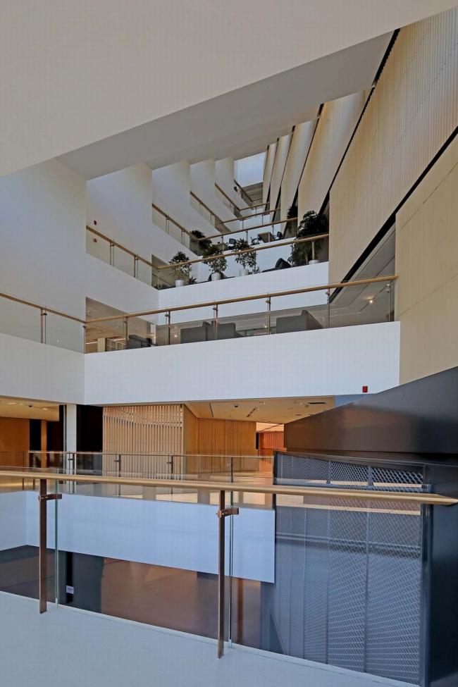 两层通高的门厅串联起咖啡厅,展厅,图书区,小超市,会议室和多功能厅等公共服务功能,这里成为创新楼公共生活的客厅。