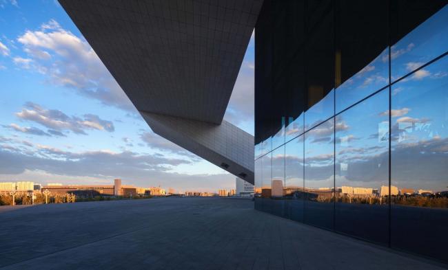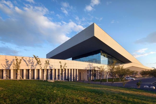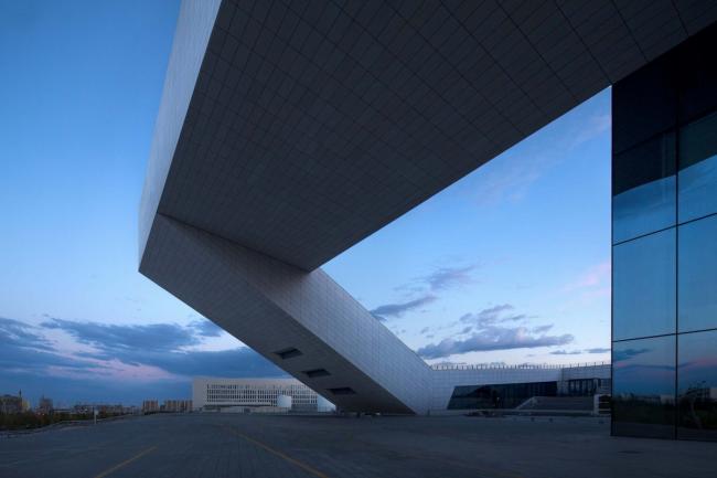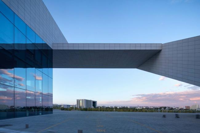 建筑主体立面采用暖灰色石材铝蜂窝板,塑造建筑坚实的体量感,并与入口门厅大面玻璃幕墙形成非常鲜明的对比。基座和大台阶采用稳重厚实的深色石材,平衡了建筑上部飘逸张扬的形态,使建筑整体和谐平稳。远瞰建筑整体,颇具乘风破浪、一飞冲天的恢弘气势。