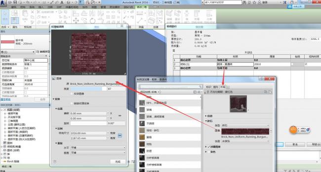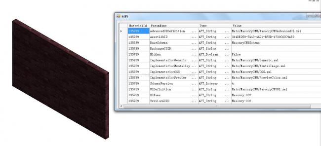 这里就以一个墙体为例,读取墙体材料的所有外观信息(如下图)。这里主要针对autodesk的官方材料库来说的。对于非官方材料库的,下面的代码里被注释掉的可以参考一下。其实读取材料的原理比较简单,过程如下: