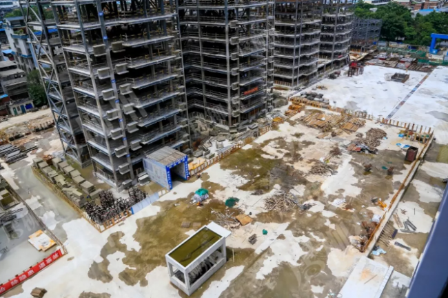 建筑外立面没有包裹严实的施工绿网,走近项目没有听到杂乱的施工噪声,现场看不到零散的钢筋、混凝土,也没有进出穿梭的水泥罐车,就连工地施工的工作人员也不多。