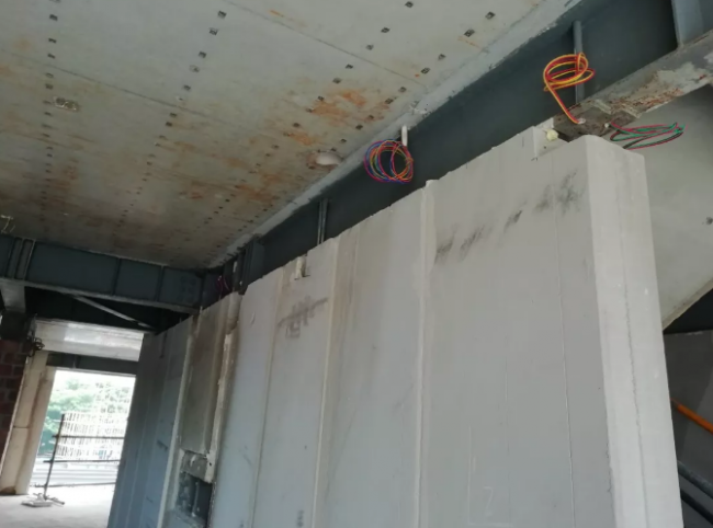 项目的墙板,颇具特色,也由工厂预制。墙体材料为蒸压加气混凝土墙板,简称ALC条板,具有轻质高强,抗折、抗冲击力强;可随意切割等特点,外墙厚度为200毫米,内墙厚度为100毫米,一般外墙厚度为200毫米,内墙厚度为200毫米,在外墙,几栋楼展现出拼装效果,还可看到装修前的拼装痕迹。