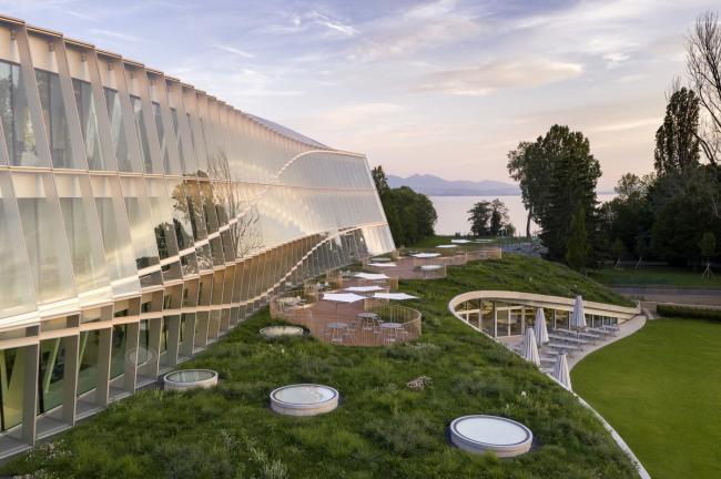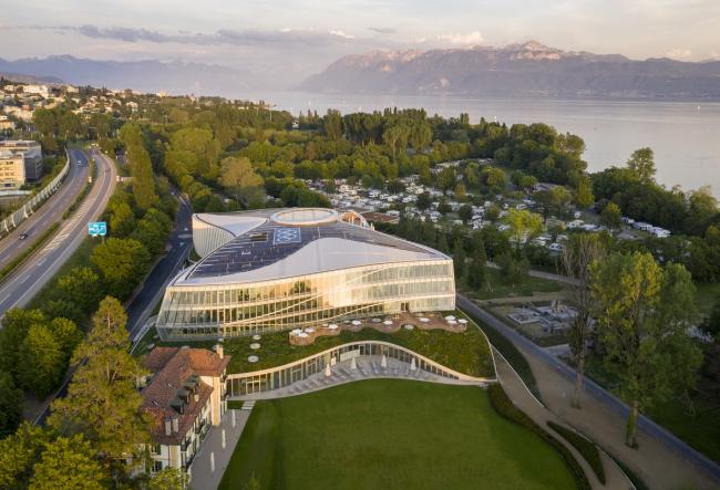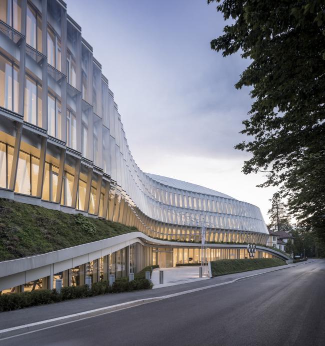 建筑的透明度象征着国际奥委会作为一个机构的开放性,并且提供了远处湖泊的壮丽景色。落地式全透明玻璃幕墙将日光引入建筑深处,同时采用双层表皮系统优化隔热效果。外立面的凹口使得公园更深入地流入办公空间。玻璃结构隐喻国际奥委会对机构透明性的追求,反映了《2020年奥林匹克议程》所发起的整体架构变化。设计使得国际奥委会工作人员的日常工作和活动得以通过立面向公众展现。