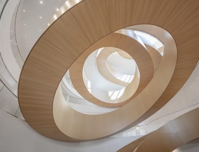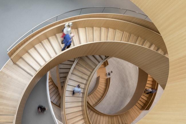 “联合阶梯”,借鉴了Baron Pierre de Coubertin创造的奥林匹克环的形象,穿过了整个建筑,通过中庭将所有楼层连接起来。遵循主动设计的原则,橡木楼梯及其边缘定义了社交活动和运动的中心区域。楼梯是国际奥委会工作人员和合作方之间团结协作的视觉表达。中央楼梯周围还设有展览空间,自助餐厅和会议室,为500位日常用户提供了一种社区感。奥林匹克之家也是许多不同的合作方之间创新合作的独特范例,包括一些国际奥委会的商业合作伙伴(陶氏,丰田和松下)、可持续性认证机构、本地政府、供应商和学者,以及国际奥委会工作人员。