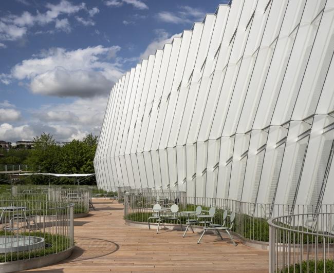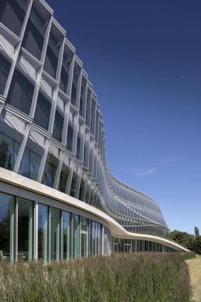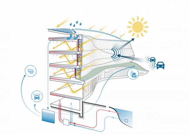 建筑物的表皮通过气密设计和内表皮上的三层玻璃实现极佳的隔热效果。立面的内层实现热量隔绝;而外层通过集成的遮阳系统保护建筑,增强了隔热效果,并减少附近高速公路的噪音。建筑物的表皮又专门设计为向内凹陷和向外突出流动形态,获得更多表皮面积用于采光和观景。