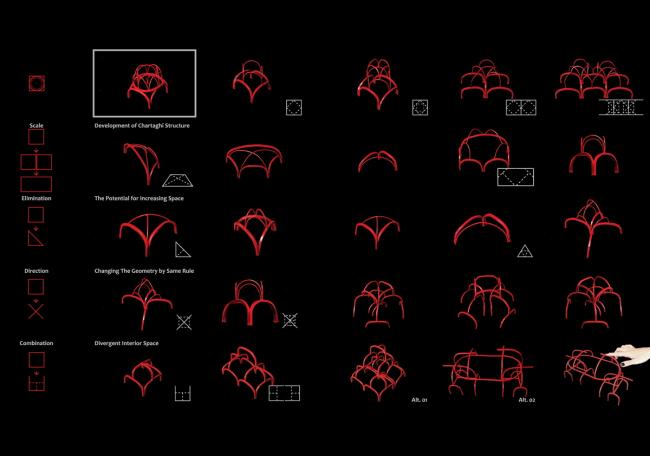 基于Chartaqi结构系统,组装在彼此顶部的半拱顶结构将结构载荷从一个楼层传递到另一个楼层。该系统形成了一种混合空间形态,介于立方体和拱顶形元素之间。