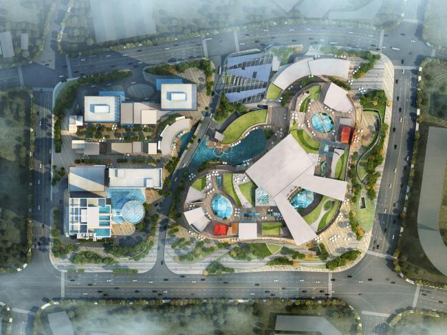 宝龙一城分三期开发,总建筑面积近 40 万平方米,其中商业体量为 12 万平方米。一期为高层办公楼,并包含配套的餐厅和酒吧;二期的购物中心为宝龙厦门标志性项目,拥有屋顶商业及娱乐区;三期为 W 酒店和办公楼,以及一个独特且极具个性的生态餐厅和高层 SOHO。JERDE通过将分三期开发的地块围绕着中央核心景观设计,并且在基地与周围紧密联系的地方设置三个出入口,成功将项目激活为一个有机的整合。
