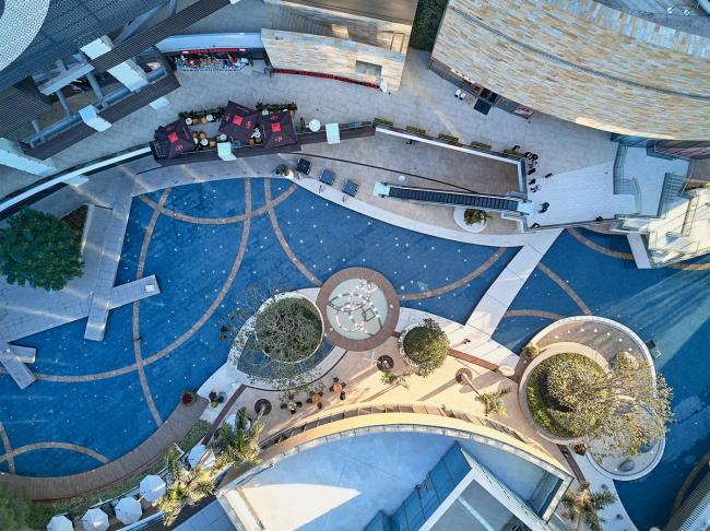 宝龙一城位于厦门市思明区金山路与吕岭路交汇处,周边遍布多个高端住宅社区,同时汇集地铁 2 号线和 5 号线,加以 3 千平方米公交枢纽站环绕,交通便捷,通达性极佳,是典型的“地铁上盖交通导向型商业”。基于这种独特的地域条件,链接性是项目成功的关键之一。JERDE 运用其娴熟的交通枢纽组织经验及人流动线的设计技巧,再一次印证了其在营造繁荣商业氛围的优势。采用了多首层设计的宝龙一城,既扩大了商业步道,起到聚拢客流的作用,亲切适宜的人性化设计,也吸引和鼓励着消费者去探索宝龙一城不同的业态和服务。JERDE 更是在 23 米的标高上打造了一个由步道环绕的中央核心景观,抬高的中央景观桥可让消费者远眺整个核心景观,坐拥整个蓝宝石湖的迷人风景。分区而设的地面落客区也提高了便捷性,通往餐厅和商业区域的人行木栈道,将整个商业综合体的各个部分有机联系在了一起。