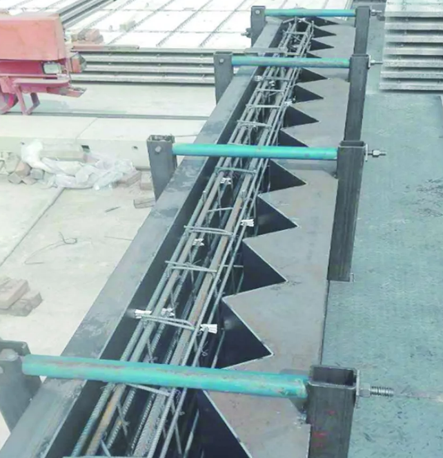 (2)边线、角部处理。清水混凝土预制构件的边线密封非常重要。对边模在底模上面的,焊接或下压牢固,一般用密封胶做好密封,将缝隙封堵;对边模在底模侧面的,一定要用顶推丝杠、定位销栓等固定措施固定好,令侧模与底模接合紧密;接合处粘贴泡沫密封条,多余部分使用壁纸刀等工具切割掉,保证拼缝处不漏浆、直线顺直。此外,有倒角的模具也应注意倒角处密封,防止漏浆。钢板折弯前应按照图纸或样板划出折弯线,根据钢板厚度、长度、折弯半径等参数选择正确的折弯“V”形模口,采用与被折钢板相同厚度的板条,试折出所需角度、圆弧、形状,核实无误后再进行实际折弯,以保证折弯的角度和光滑度。