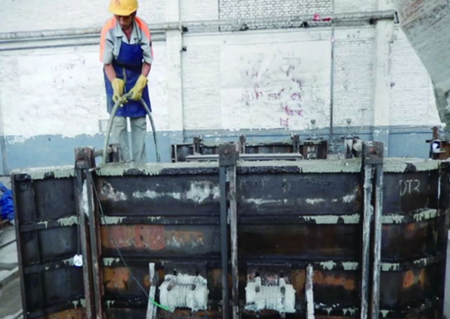 根据清水混凝土预制构件特点选择适合的生产工艺,不同的构件生产工艺有不同的振捣方式。常用的振捣方式有台式振捣、附着式振捣器、插入式振捣棒三种。恰当的振捣方式和方法能减少表观气泡、增加混凝土密实性、有利于表观颜色光亮一致,增强清水混凝土预制构件的装饰效果。