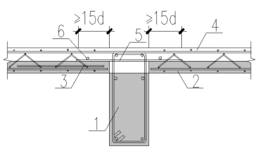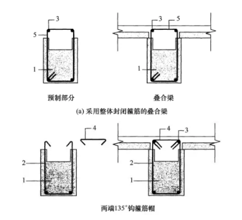 1-预制梁;2-开口箍筋;3-上部纵向钢筋;4-箍筋帽;5-封闭箍筋