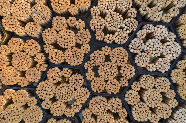 在展馆中,阳光穿透垂直的原木,照射在底层(BIM设计)由木头雕刻的有机形状的座位与抛光混凝土圆形平台之上,创造出柔和的光影效果。座位的空间复杂性通过不同的位置摆放突出周围的迷人景色,并鼓励游客根据自己的意愿寻找适当的位置。实际上,通过这种探索,人们可以发现展馆不同的空间配置,可以小团体聚会,也可以和朋友聊天,可以和伴侣一起躺着欣赏浪漫的风景,也可以在参观艺术中心的时候独自坐着冥想。