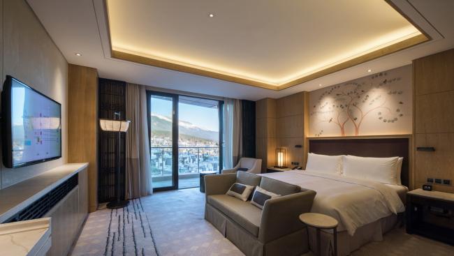 建筑主体左右两侧的386 间客房,每间都配有独立阳台,视野开阔。房间布局是常见的希尔顿风格,没有过多的装饰与色彩,简单干净而不冷清。早晨伴着洱海第一缕阳光醒来,这是大理希尔顿提供的最美妙的体验之一。