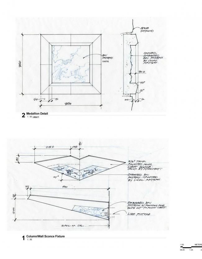 酒店立面选用大理盛产的石材,装饰设计构思取材于白族传统图案。木质结构的屋顶结合金属板,在保证功能的同时实现古朴亲切的度假诉求。整体风格与自然风景协调一致,充满诗意。外墙面多为上白(石灰),下灰(细泥)粉刷,内墙面多用凸花青砖组合成丰富多彩的立体图案,或镶嵌自然山水图案的大理石,表现出一种清新雅致的情趣。