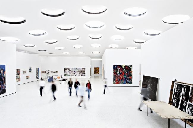整个弧形的屋顶盖板仅由12根纤细的钢筋混凝土柱加以支撑。此外,因扩建的新馆位于水位线下方,故建筑师用160根深桩对其进行了加固,以防止新馆的浮动。同时,新馆还设置了36个冷热交换井。整个热量循环系统一直深入到地下82米的地方,旨在冬天为室内供暖,夏天供冷。