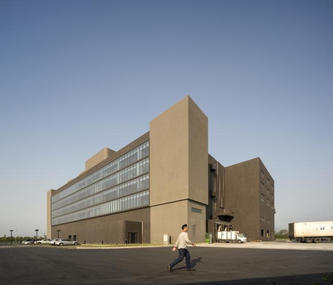 厂房的外皮用的是表面粗糙的陶砖。在台湾面砖是非常常见的外墙材料,无论烈日到雨季的豪雨皆能有效的保护建筑物。紫咖啡色的粗糙面砖呼应着屏东肥沃的土壤。透过两种不同纹理的拼配,让外墙制造出手工火腿的质感与细致的效果。