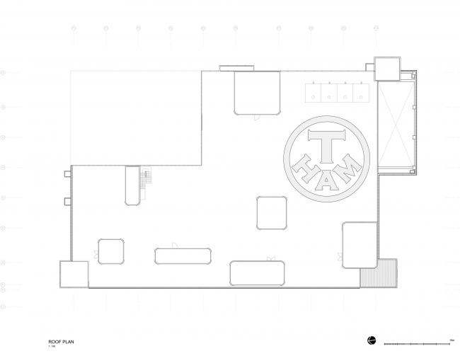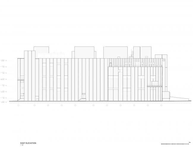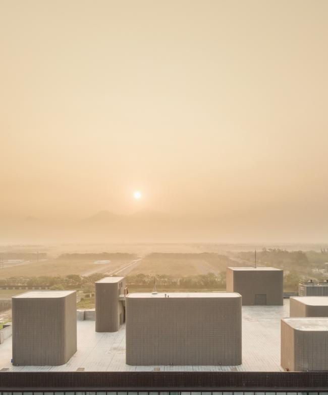 屋顶上七座生产用的电梯朝向天际。它们的高度虽因为功能需求而被设限,但经由我们修饰外观之后,使这些塔看起来更像雕塑品,这些造型呼应着厂区背后的中央山脉。透过他们,我们给了这个厂房它独特又稳重的身份。屋顶上的大型开放空间可被用来清洗厂房设备,举办特殊活动,或给员工休息。