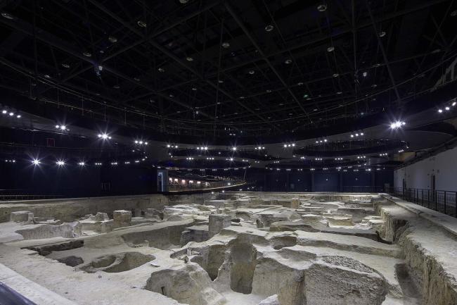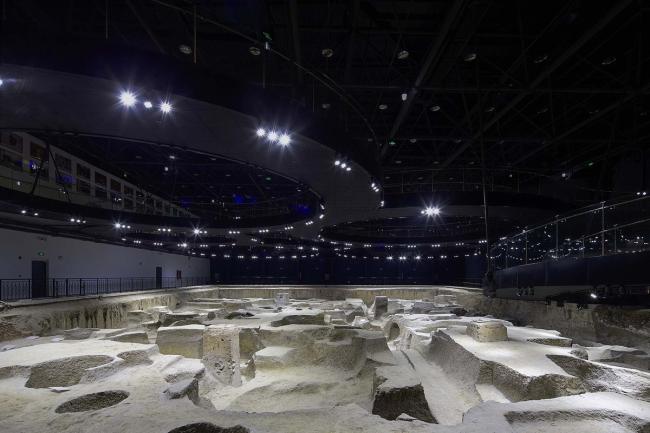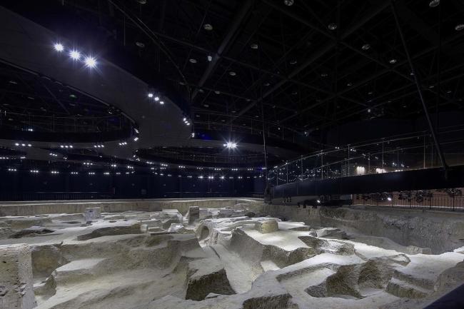 一个52米x52米网架提供了覆盖在遗址坑上方的无柱空间,满足对遗址的保护需求。门厅和管理用房也位于这个棚架下,和遗址坑形成内外两种空间(BIM)。
