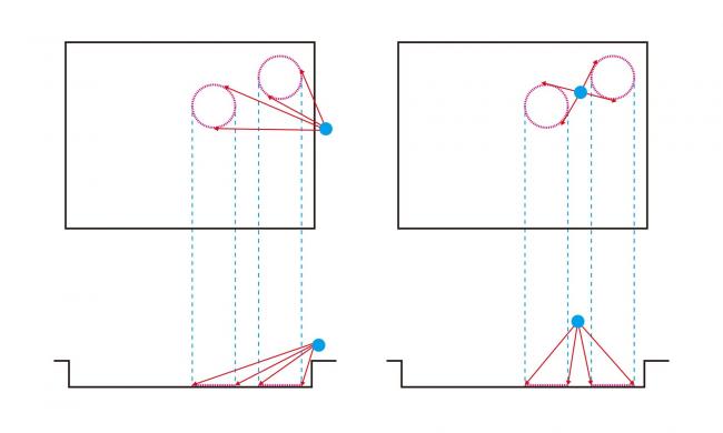 常规模式是沿着遗址坑周边安排参观流线。在这里,我们把主要参观流线悬吊在空中,提供了比常规模式高效且更为丰富的参观体验。一个巨大的环形坡道连接着入口层和参观层。