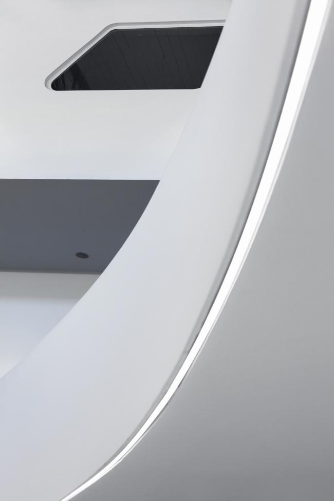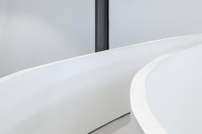 而于药房的内部,建筑师在原有仓库的开放空间里,置入了一个新的夹层空间,以从各个方向串联空间的流线。地面层与夹层,则是通过一个旋转楼梯连接的,旨在连通上下层的同时,于室内创造一条富有动感的弧线。此外,旋转楼梯所形成的弧形空间,为会议室和办公室的设置提供了充足的条件。药房的室内设计,与外立面保持了高度的统一。两者都是以海洋(BIM工程师)的形式语言作为设计的参照。