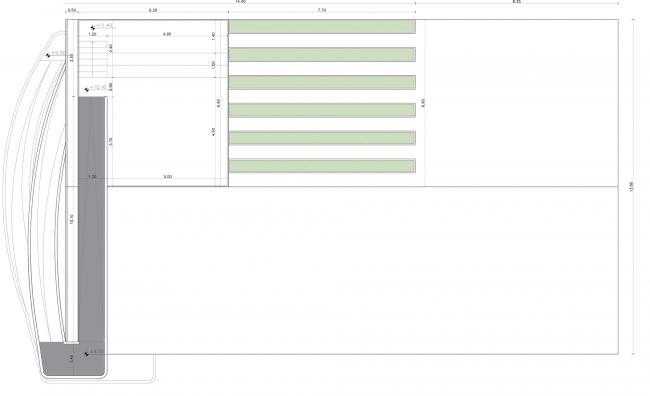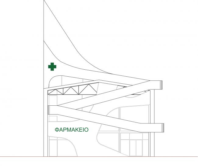 建筑师在药房的顶部,利用穿孔金属板,设计了一个巨型的三角结构,以让这栋建筑在比雷埃夫斯港口(port of Piraeus)的最远端,都可以明显地被人们看到。药房外部的通道则被设计成台阶的形式,以为日后植物园的营造打下基础。这栋翻新的建筑与毗邻的港口,不管是概念上,还是外形空间上,都保持了一个稳定良好的关系。