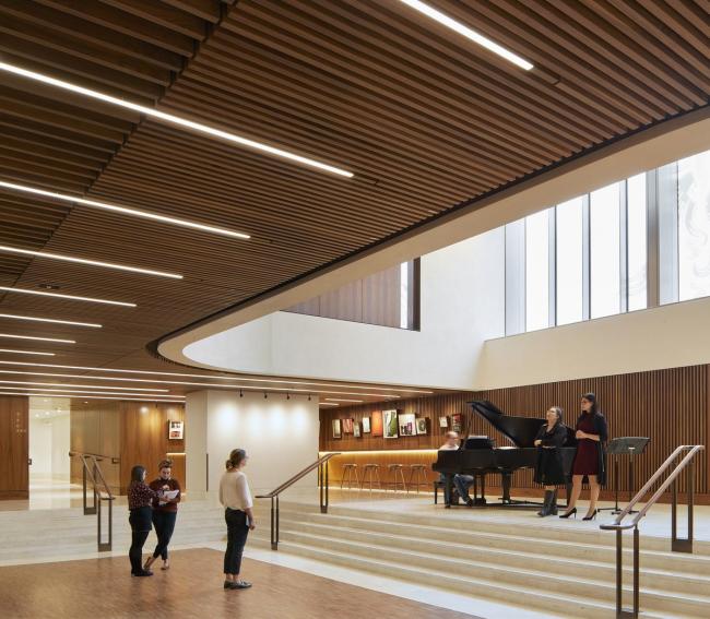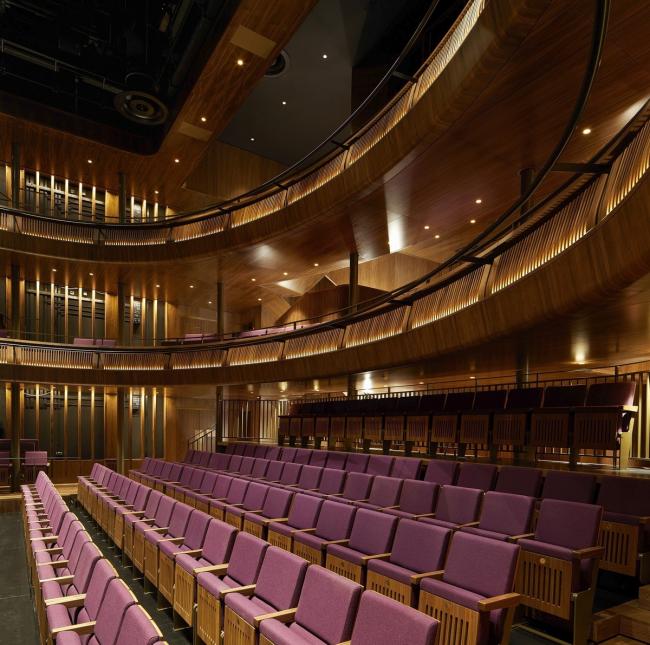 新的林伯里厅——该礼堂替代了现有工作室剧院,变得更加舒适且充满个性,可到达性和技术性能也得到了提高,保持了一个400座位礼堂的亲密感。礼堂采用了精心制作的美国黑胡桃木,并安置了最先进的可调节软垫座椅,同时具备先进的电声技术。
