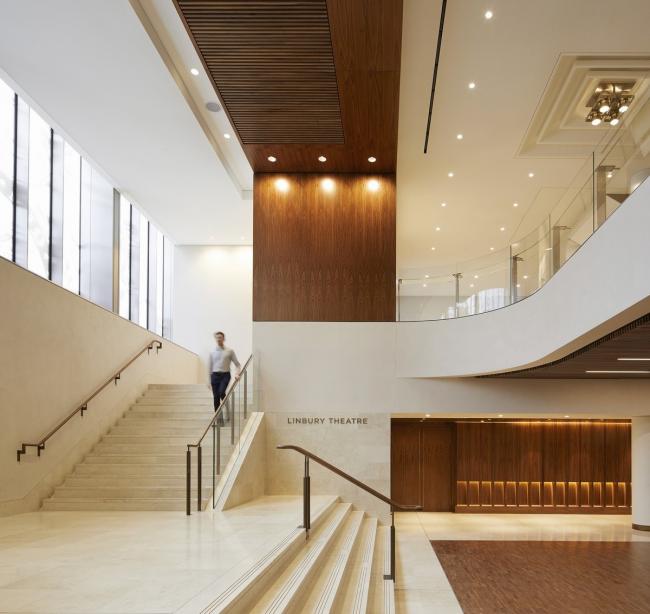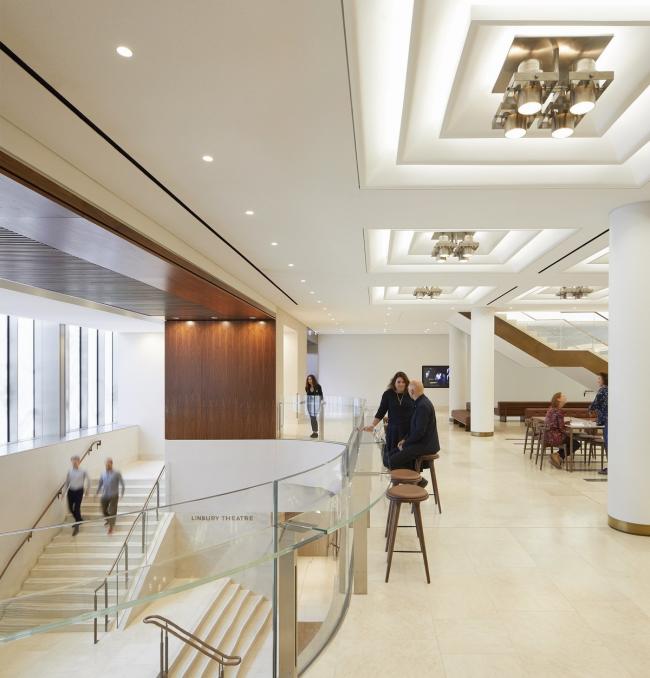新门厅——重新设计的Bow Street和广场入口通过扩建的门厅连接起来,该门厅贯穿一楼,向下延伸至林伯里厅的新门厅。这些门厅由两层通高空间连接,可以用于即兴活动和表演。斯坦顿·威廉姆斯通过对衣帽间和女厕所的空间重新配置,以及对票房运作的重新思考,实现了门厅空间的显著增加。