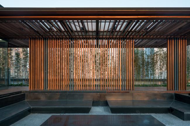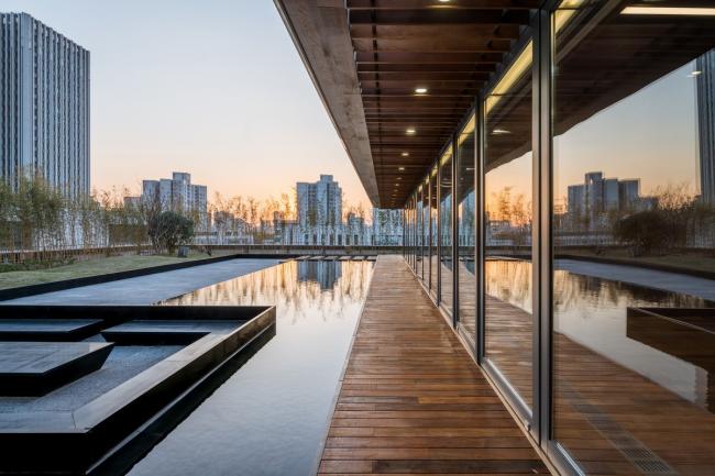 极致化处理的轻盈重檐屋顶让尺度宜人的建筑又具有了一种自由感。上层檐配有大天窗的钛锌版屋面和下层檐的阳光板屋面相配合弱化了建筑的体量,而其下统一的实木格栅平顶让建筑内外覆盖下都光线自然柔和。