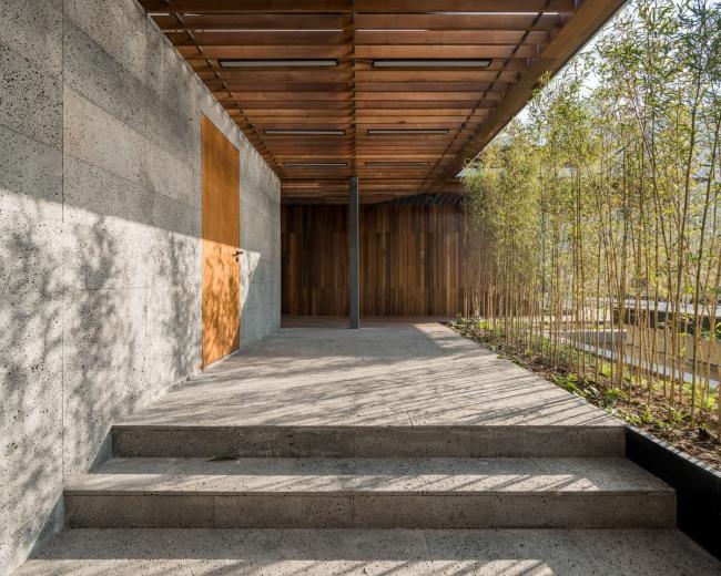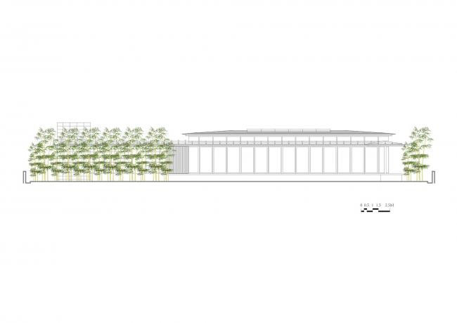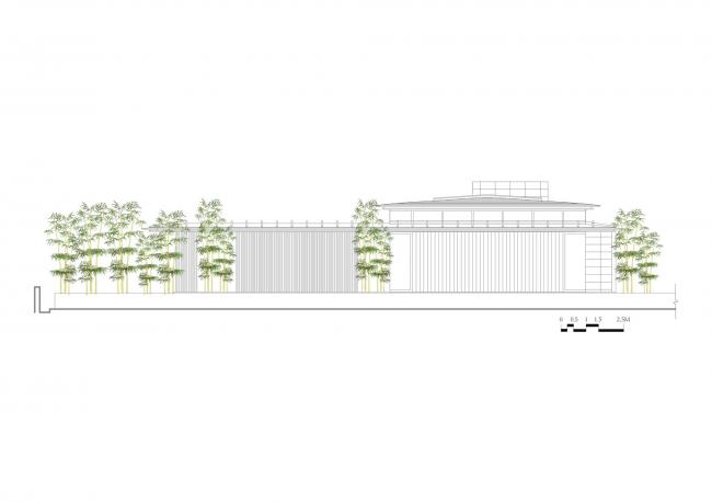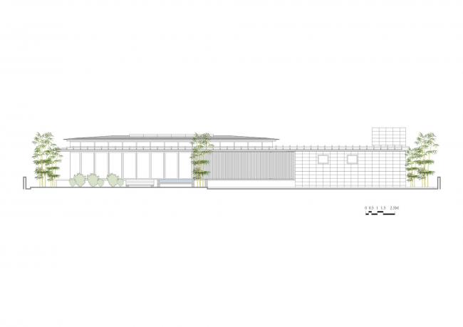 南庭阔长,以一个与建筑主体等宽的横向无边方池与南侧檐廊接平,水池西端的汀步跨越过去是一个下沉的活动空间,并有室外茶座伸入池中,而整个南庭的外周都以修竹掩映以营造隔而又透、水天一色的视景。