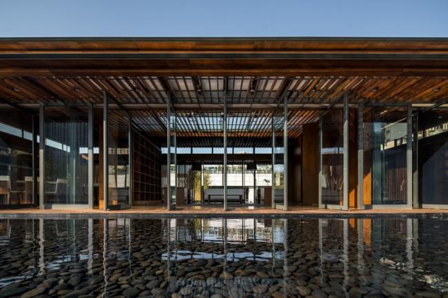 建筑南北两面都是连续的中轴旋开落地玻璃门,在合适的天气可以全部打开,这时“三间”于是南北通透,采阴纳阳,与庭园真正融为一体。