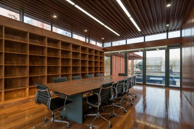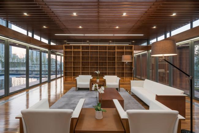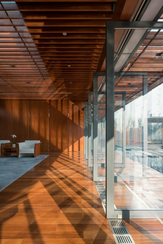 建筑抬高的架空平台下正好容纳空调地送风系统,而建筑主体采用纤细的轻钢结构,辅以温暖沉着的木质内外饰面。
