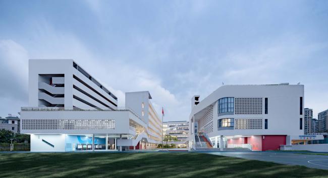 前海三小(现更名为深圳南山实验教育集团荔湾小学)坐落于深圳南山区大南山脚下,位于月亮湾大道以东,前海路以西,港前路以北,基地北侧紧邻居住小区。校园总用地面积13048㎡,在起初的公开招投标中,办学规模要求是24班的小学,由于周边学位数量的严重紧缺,最后班级数量调整至不小于36个,因此最终总建筑面积33200㎡,容积率1.7。与深标规定的合理的小学容积率0.8相比,在如此高的容积率条件下,如何营造健康轻松、舒适开放的立体校园空间成了设计的关键。