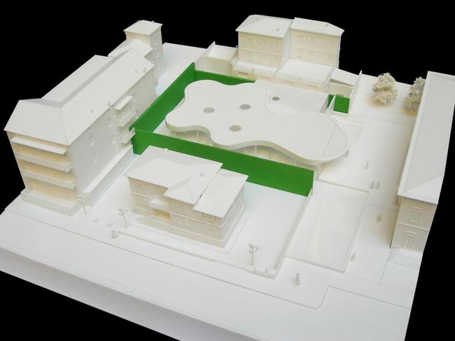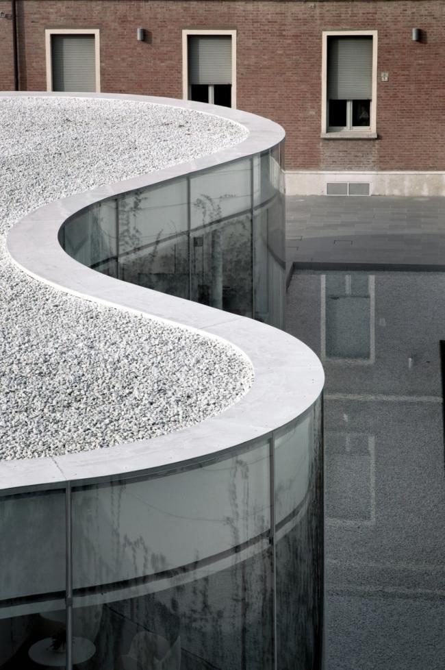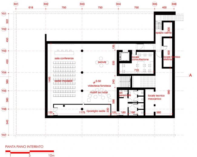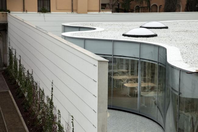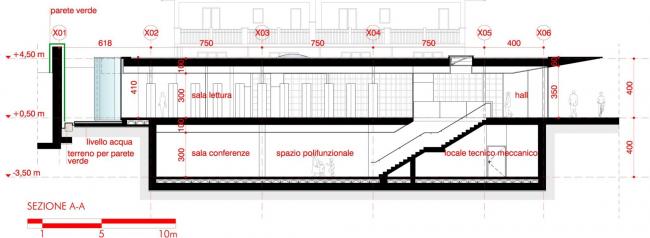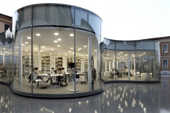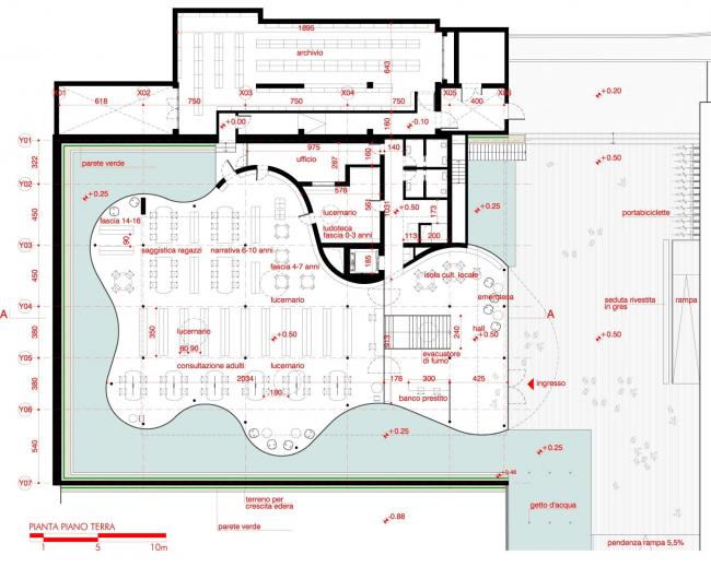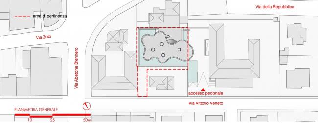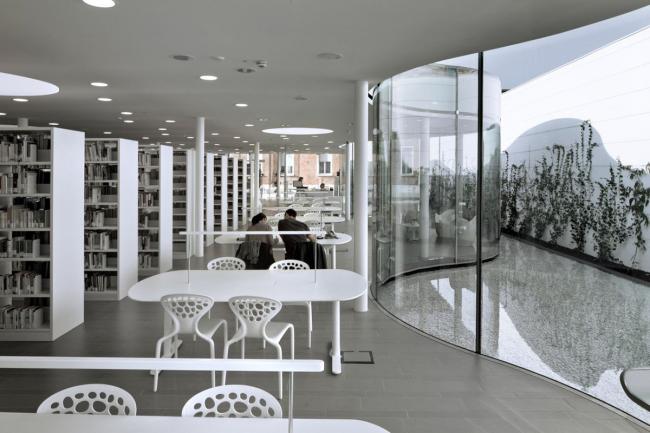 项目地点在摩德纳马拉内罗VittorioVeneto街道,这是一个发展良好的住宅网络。建筑外墙北侧跟住宅庭院相接,西侧是公共空间,南侧部分依附于住宅楼,东侧是另一个部分倚靠的住宅楼。设计项目表面积为1175平米。这是一个现有建筑改造项目,北围墙修护,东侧和南侧受办公楼和住宅限制,原先的中央部分拆除,在原体量中置(BIM工程师)入图书馆,高度保持和旧楼一致,外部向外并向下发展。新图书馆入口被设置在西侧。