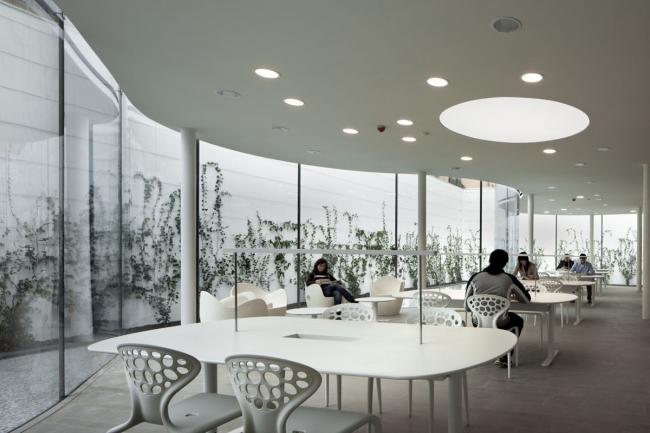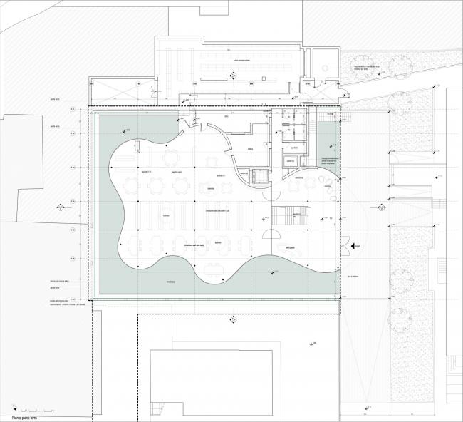 一个主要用作咖啡区的透明体积在底层,同时配备了一些服务空间和大桌子,为“神话之地马拉内罗”社团提供的解说空间,以及所有图书馆使用者的咨询和阅览空间。体量还映射在周围的水面上,得到深绿色的回应,丰富了项目保留下来的围墙。屋顶平台伸出指向公共空间,并增加了建筑从街道上的识别性。室内使用纯白树脂地板和家具,外部的绿色通过玻璃幕墙反射进来让他们沿着幕墙的曲线闪耀着绿光。