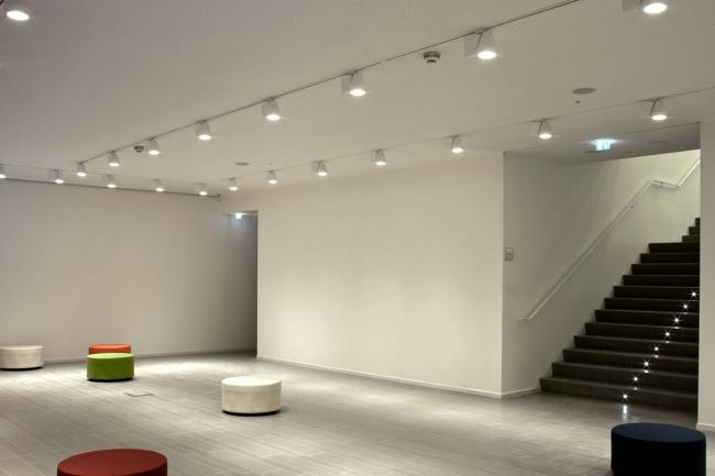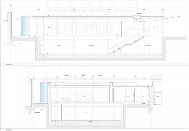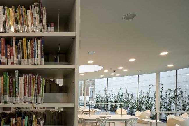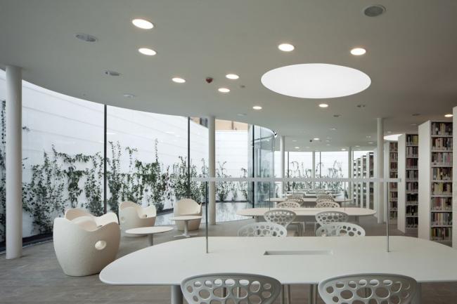 弥漫在图书馆开放空间的灯光在反射游戏中在白色的家具之间来回跳跃,地板上的物件,结构物体,水,还有延续的透明玻璃。一个白色不透明的体量被放在南侧,他包括了服务空间,楼梯通道地下室游戏室,开窗提供自然光照明。地下室为楼梯连接平行六面体入口,电梯的设置服务了残障人士,运送货物和书籍的货梯也有配备。我们很快发现一个多功能室构成自由展示空间,我们可以根据个人喜好进行个性设置。在这个地下区域也有图书馆财产的储藏室,还有小众的当地历史文件。