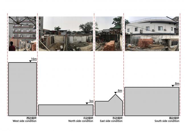 2018年春,我们遇见了这处被大棚盖住的“院落”,占地约200平米左右。场地所在的院落,需穿过一条杂乱的胡同,由北向的院门进入。其西,东,南三面均为楼房。整个场地宛若处于一处峡凹,只有北边的空间视线较为开阔。我试图从这里去寻找和周边老城区的关系。