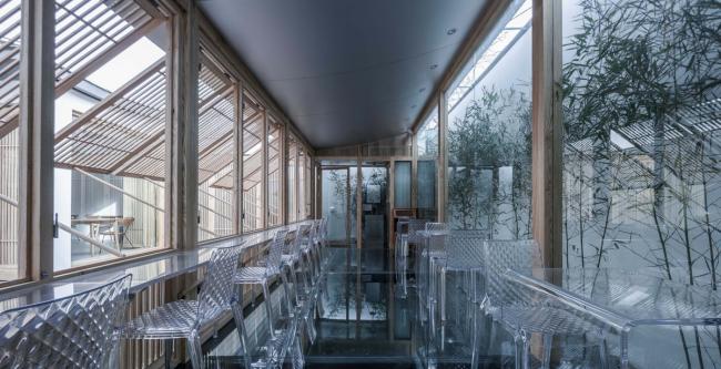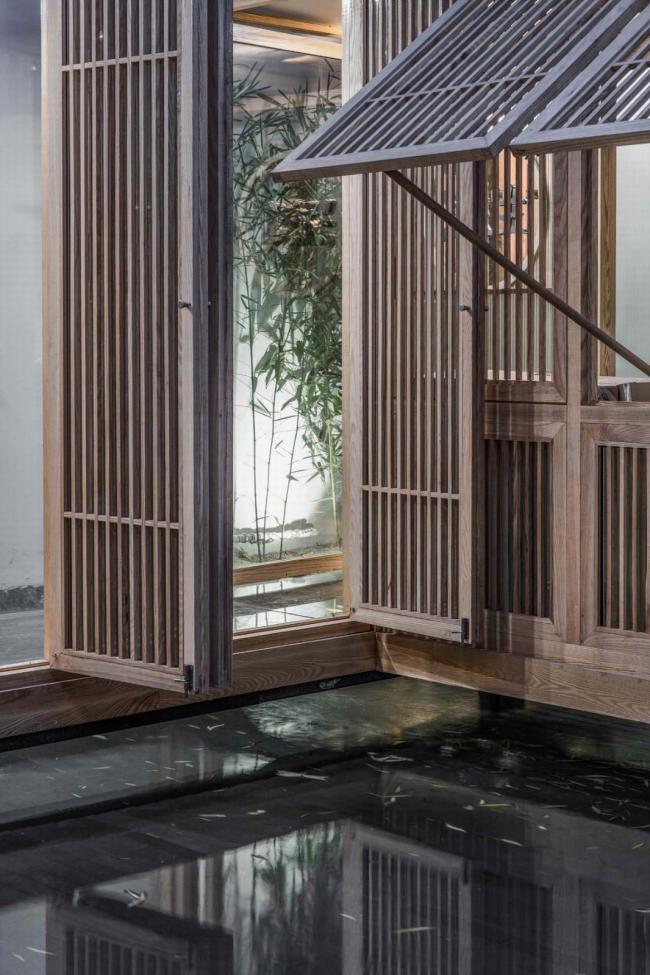 水廊的南,北,西三个立面均为玻璃维护,玻璃墙与院墙之间均留有空地,种竹环绕,使整个廊子三面都包裹在竹荫之中,一年四季,翠色环绕。