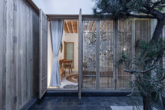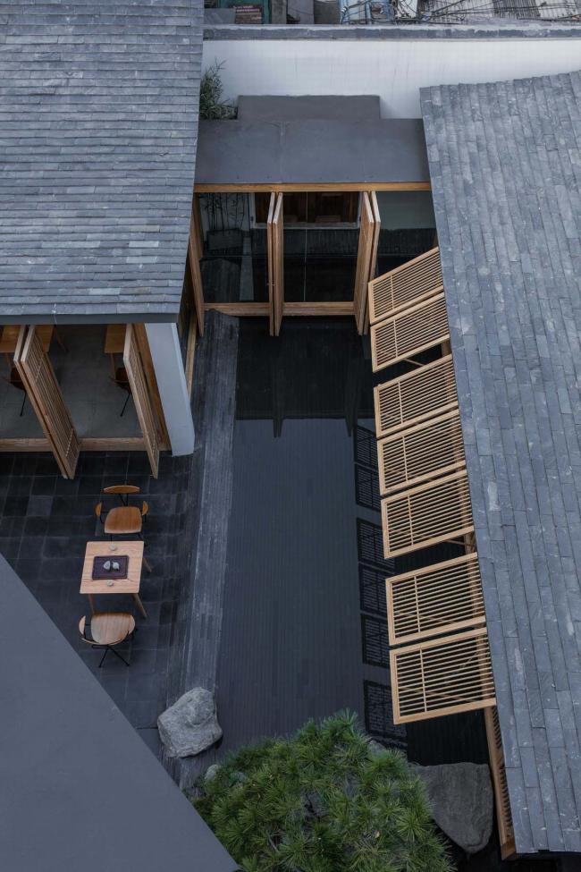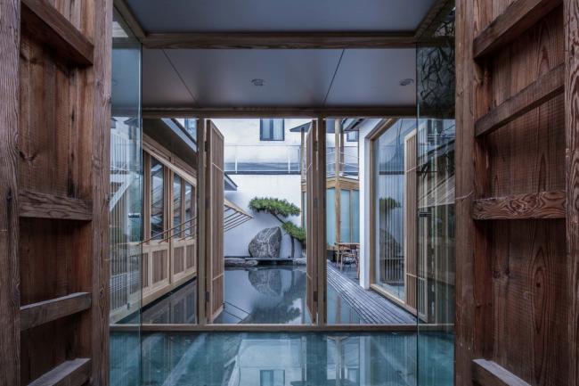 其五:水院水院客房位于松院客房的西边。其南边为一处浅水池庭院。庭院西墙悬挂楼梯,通向客房的二楼茶室梯云舫。客房南面采用透光的三组格栅门扇围合,和西园庭院相交的东边界面则采用三组实木板门扇,虚实相映。当东墙门扇打开时,视线可透过西园穿透至到水廊处。