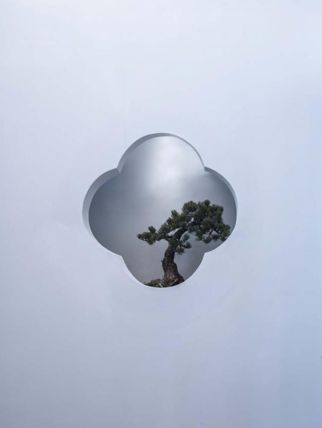 最后是“层林”的进驻,是画面刻画,完善的过程。主要由门扇和植物构成。门扇拟林,植物为林。竖向的门扇或实或虚,格栅密布,与鲜活的松竹交相错落,构成浪里的层林。